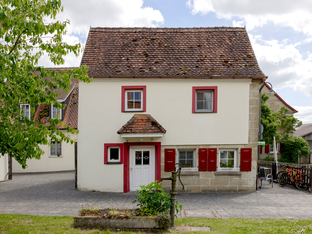 ferienhaus kornblume aussenaufnahme mit wiese und alte wasserpumpe